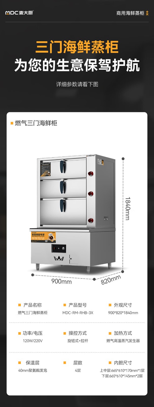麥大廚商用蒸柜900mm燃氣款三門海鮮蒸柜