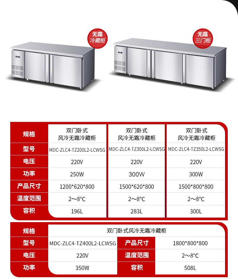 麥大廚雙門1.5m臥式風冷無霜冷藏柜300L