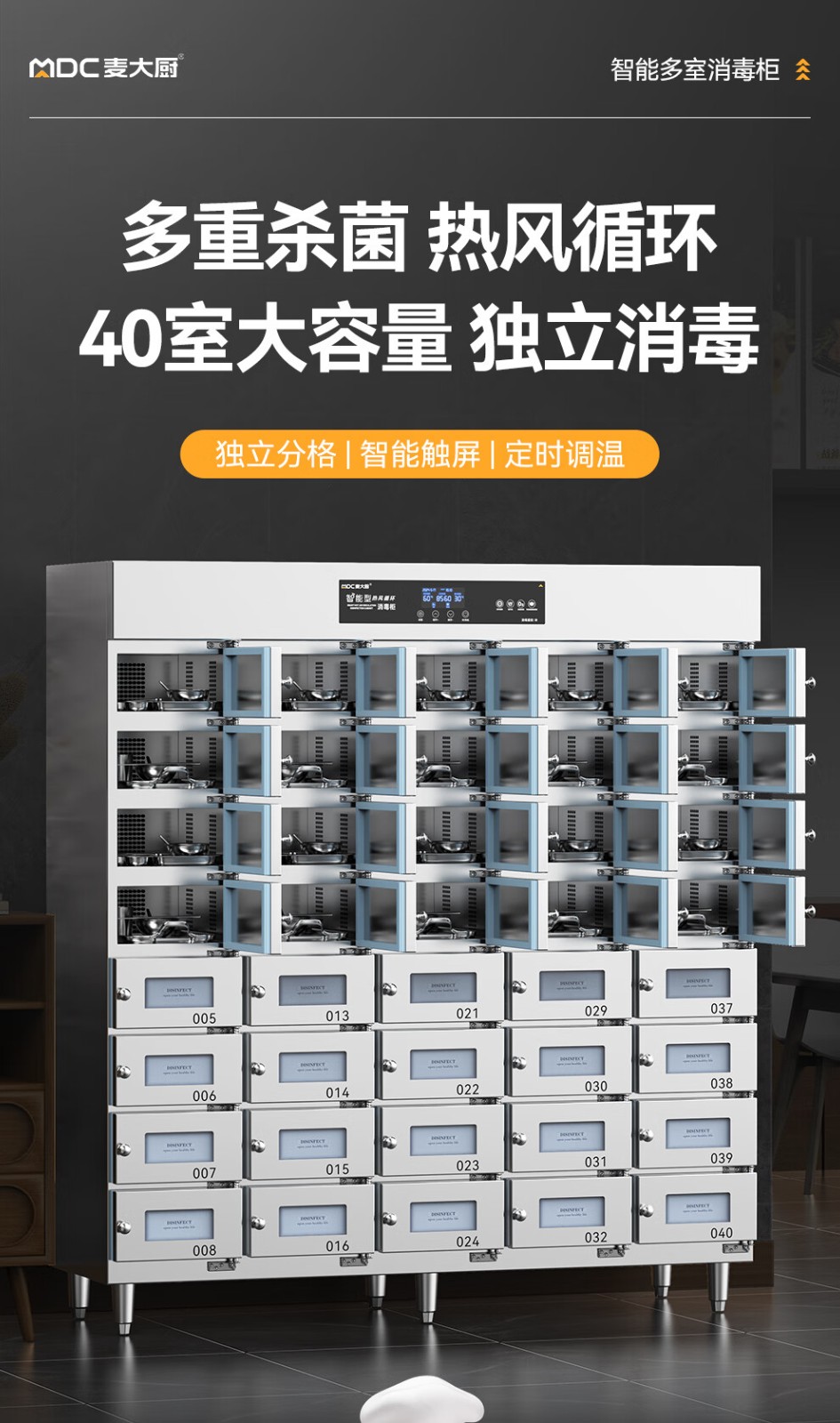 首頁 > 商廚產(chǎn)品 > 消毒柜 > 格子消毒柜 >麥大廚40室智能觸屏型熱風(fēng)循環(huán)中溫消毒柜4.5KW