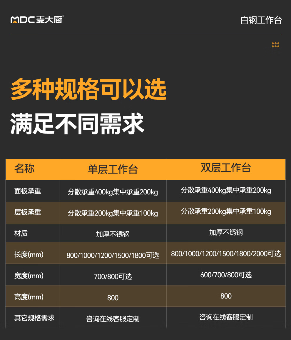 - 更多MDC商用單層工作臺規格咨詢在線客服