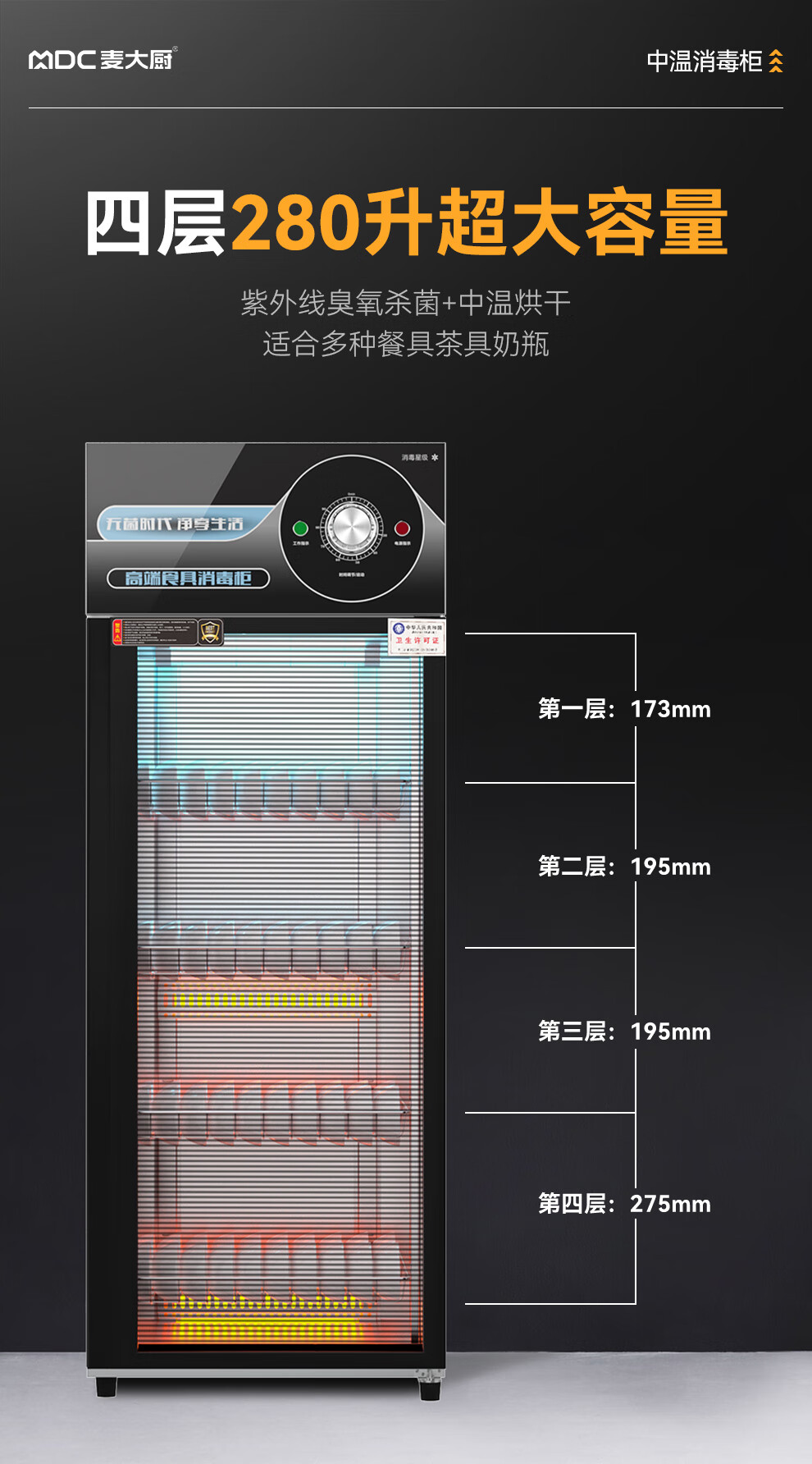 麥大廚高端款220V單門280L中溫食具消毒柜610W